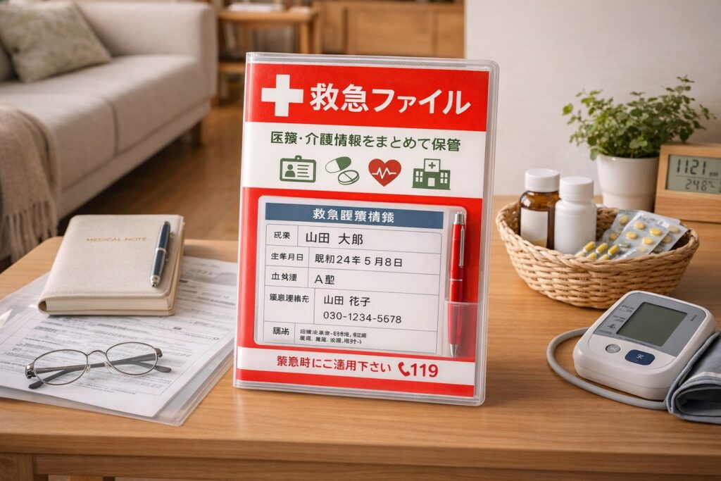 冷蔵庫の横など、救急隊員が必ず確認する場所に以下の情報をまとめた「救急ファイル」を作成します。