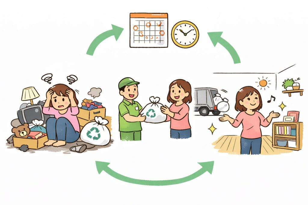 一度不用品を処分するだけではなく、それを定期的に行うことで快適な生活空間を維持できます。不用品は引っ越しのタイミングや季節ごとの整理、お子さんの成長に合わせて発生することが多いです。その際、自治体の無料回収や不用品回収業者を活用すると効率的です。この定期的な片付けにより生活の中での煩雑さが大幅に減り、快適な空間が保たれます。