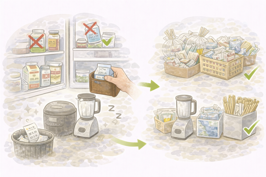 ストック: 割り箸や保冷剤など、「無料でもらえるモノ」が溢れていないかチェックしましょう。