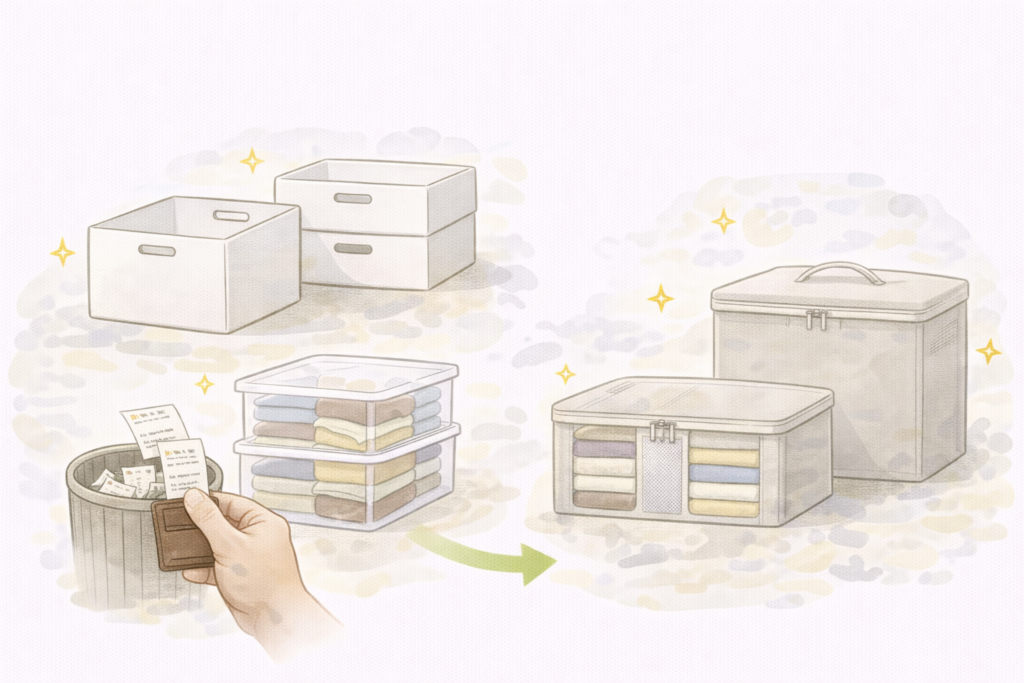 どうしても判断できないモノは、無理に捨てなくて構いません。そんな時のために「保留箱」を用意しましょう。 箱に「202X年〇月まで」と期限を書き、中身が見えないように封をします。その期限までに一度も箱を開けなかったなら、それは今のあなたに必要ないモノだという動かぬ証拠になります。