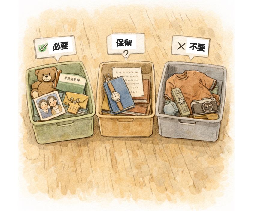次に、持ち物を「必要」「不要」「保留」に分けていきます。
