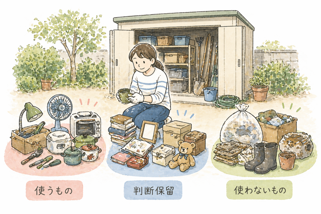 物置の中身はすべて一度外に出し、「使う・使わない・